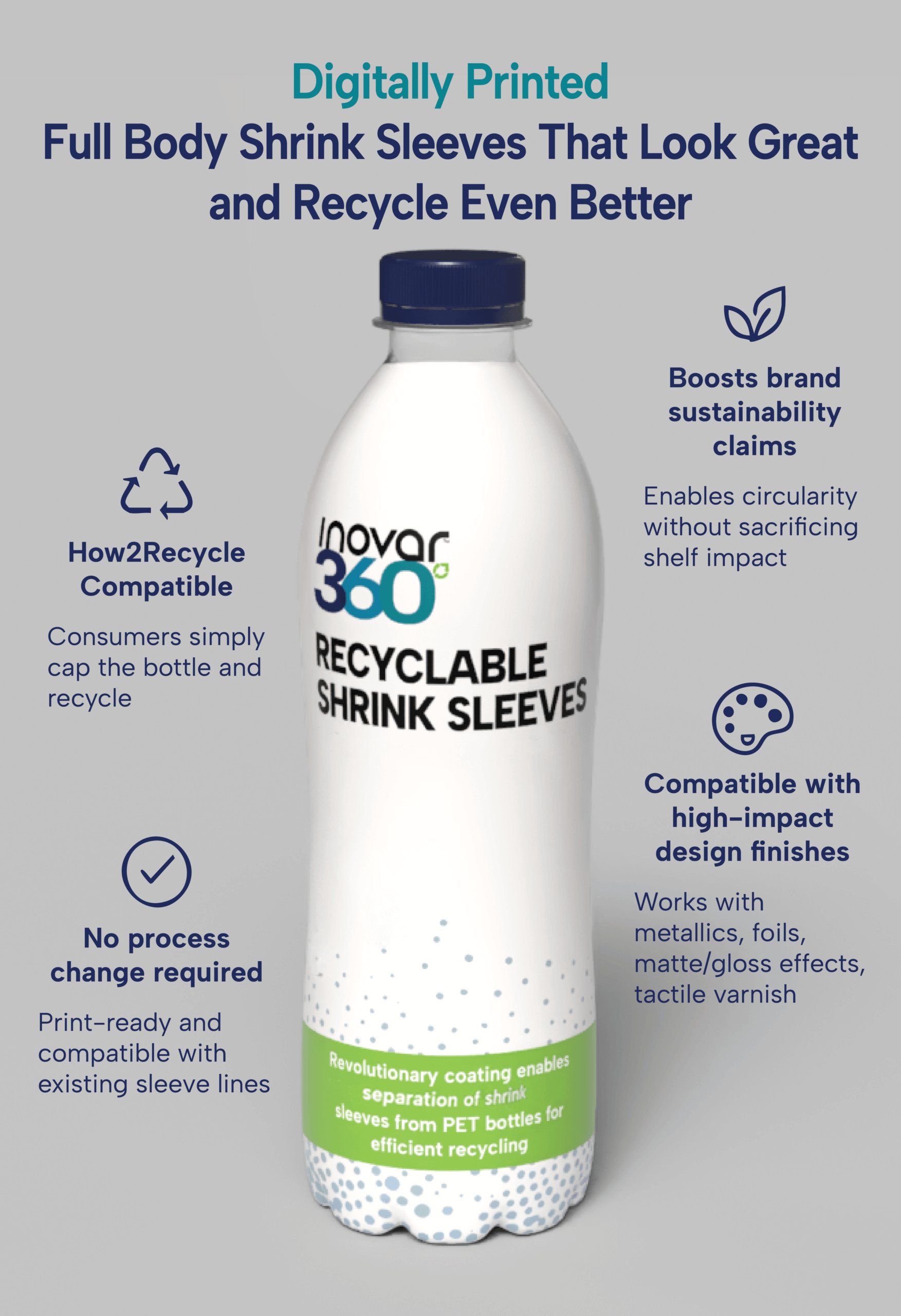 - Digitally Printed Shrink Sleeves Designed for Recycling: Digitally printed shrink sleeves that meet APR guidelines and are suitable for indirect food contact delivering full-body, high-impact graphics with sustainability in mind. Benefits: Full-body digital graphics that support efficient recycling and easy consumer disposal, without compromising shelf impact or design flexibility.